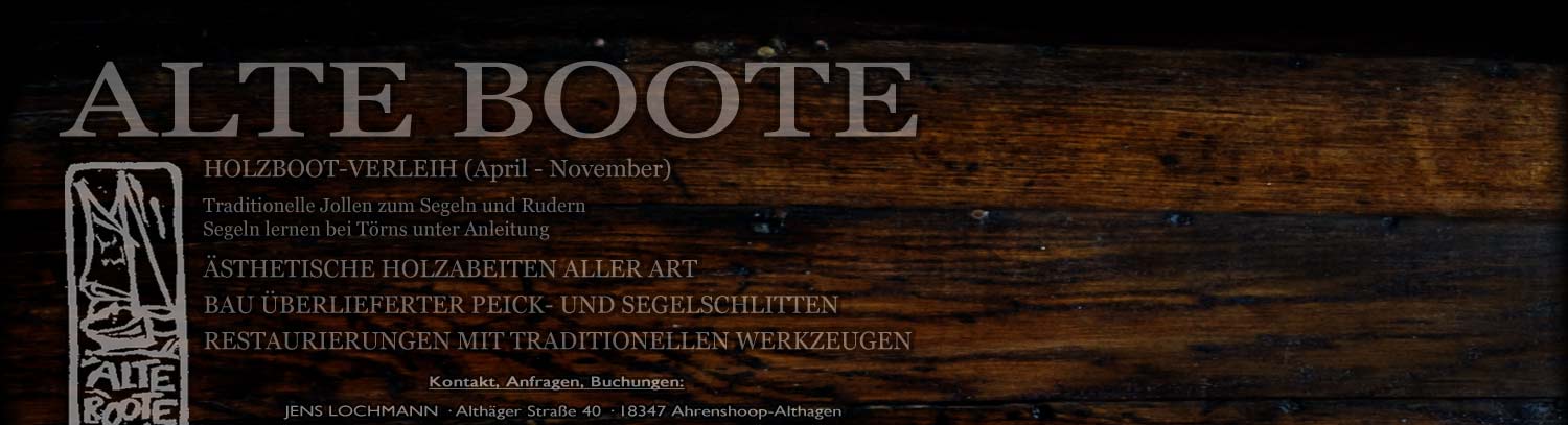 AlteBoote.de ist ein Angebot an alle Naturfreunde und Liebhaber traditionellen Handwerks. Bei Jens Lochmann haben Sie die Möglichkeit, restaurierte Jollen zu mieten. Wer noch nicht segeln kann, sollte eine Tour unter Anleitung buchen. 'Segeln kann Jeder!' (lernen ;-)